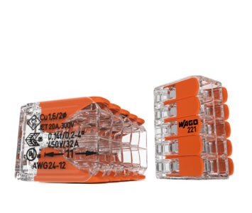 Borne de connexion compacte de Wago avec leviers, permettant une connexion rapide et fiable sans outil de jusqu'à dix conducteurs…