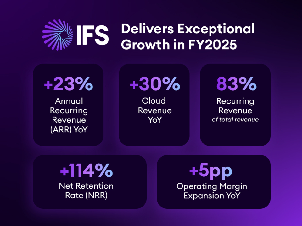 IFS, spécialiste des logiciels d’IA industrielle, a annoncé ses résultats financiers pour l’exercice 2025. L’entreprise affiche une croissance de +23 % de son chiffre d’affaires récurrent annuel, une forte progression de sa marge opéra!onnelle (+5 points sur un an), ainsi qu’un élargissement de sa base clients : la société compte parmi ses nouveaux clients de grandes entreprises comme ArcelorMittal, TotalEnergies, Hitachi Energy ou encore Japan Airlines. La section Cloud a également augmenté de +30 % sur l’année écoulée. « Ces résultats illustrent la qualité de notre croissance : +23 % d’ARR (chiffre d’affaires récurrent annuel), 114 % de NRR (taux de rétention nette), +5 points de marge. Avec 83 % de revenus récurrents, nous bénéficions d’une grande visibilité et d’une base financière solide pour continuer à innover tout en maintenant notre rentabilité », précise Matthias Heiden, directeur financier du groupe.