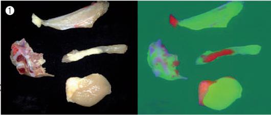 Alors que sur l'image réelle (à gauche), montrant des morceaux de poulet, on ne peut que difficilement distinguer le gras du cartilage, l'image CCI (à droite) fait clairement apparaître la différence entre la viande (en vert), le gras (en rouge) et les os (en bleu).